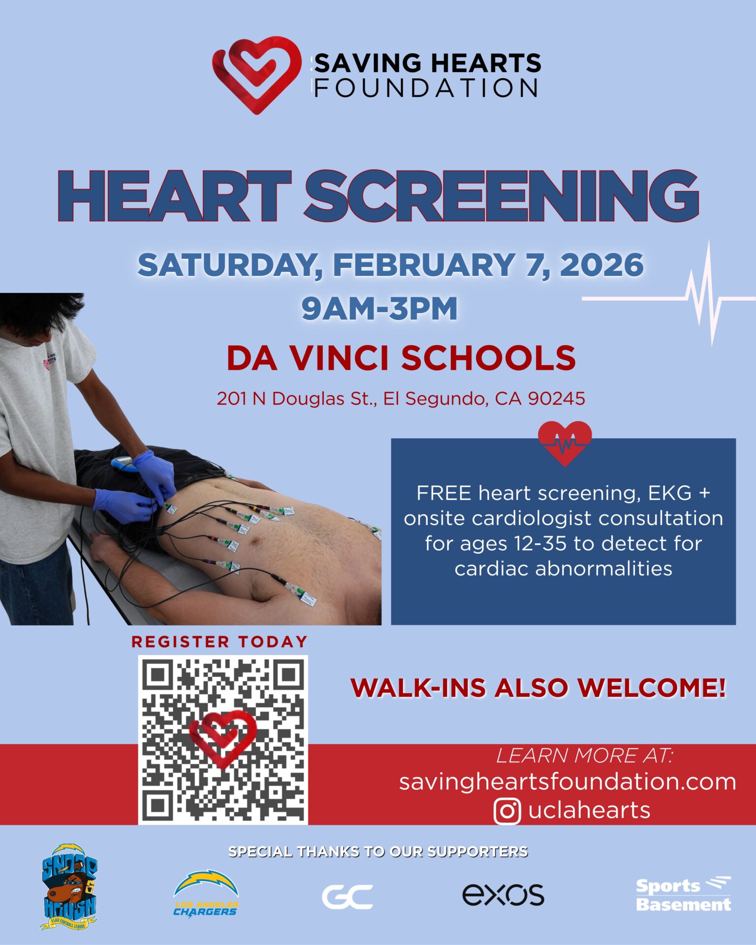 Your heart health matters—on and off the field. We’re excited to invite all Da Vinci students, student-athletes, and community youth to a FREE Heart Screening Event hosted by the Saving Hearts Foundation.