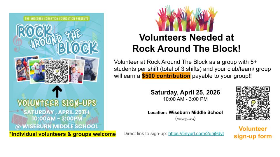 As in past years, the Wiseburn Ed Foundation is seeking a large number of high school volunteers. Groups that sign up with at least 5 volunteers per shift (there are 3 shifts total) will earn a $500 contribution for their club, team, or org. This is a fantastic opportunity for your teams to earn money for ongoing program needs.