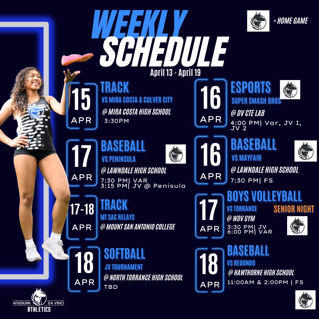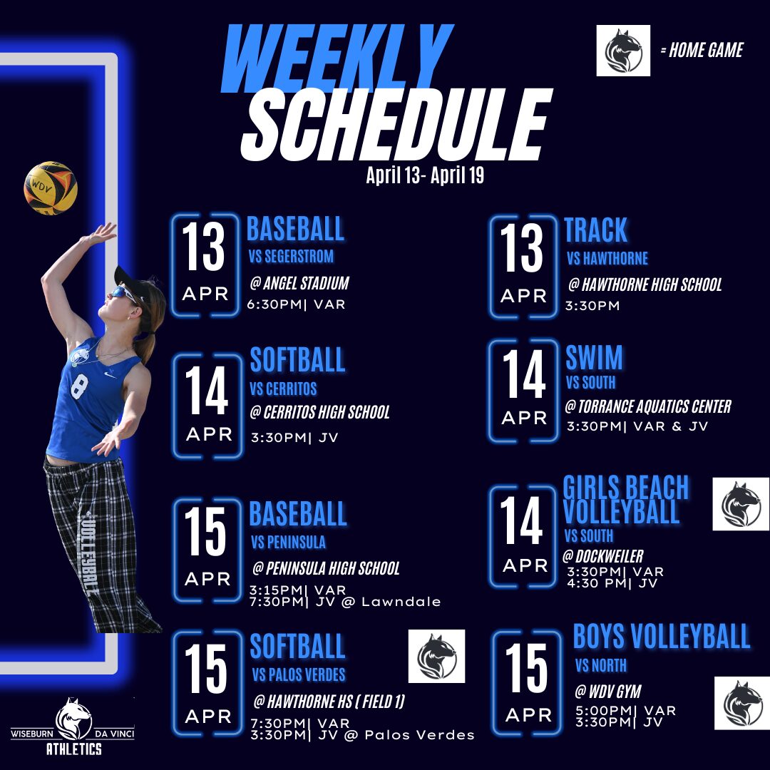🏊👟⚾️🥎🏐🐺⚡️ Wiseburn Da Vinci Athletics Schedule April 13 – April 19! ⚾️🥎🏐👟🏊🐺⚡️