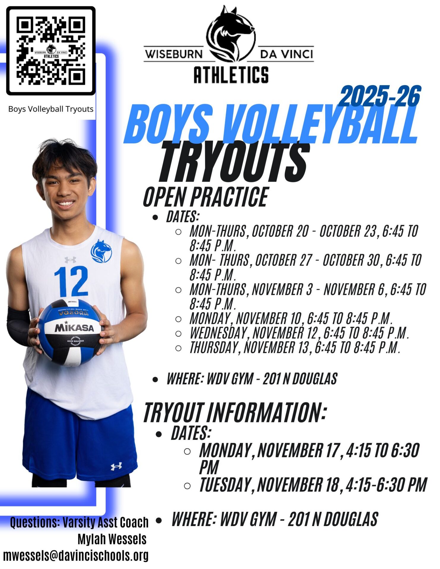 The Wiseburn Da Vinci Athletics Department is excited to announce open practices and tryouts for the 2025–26 Boys Volleyball season!