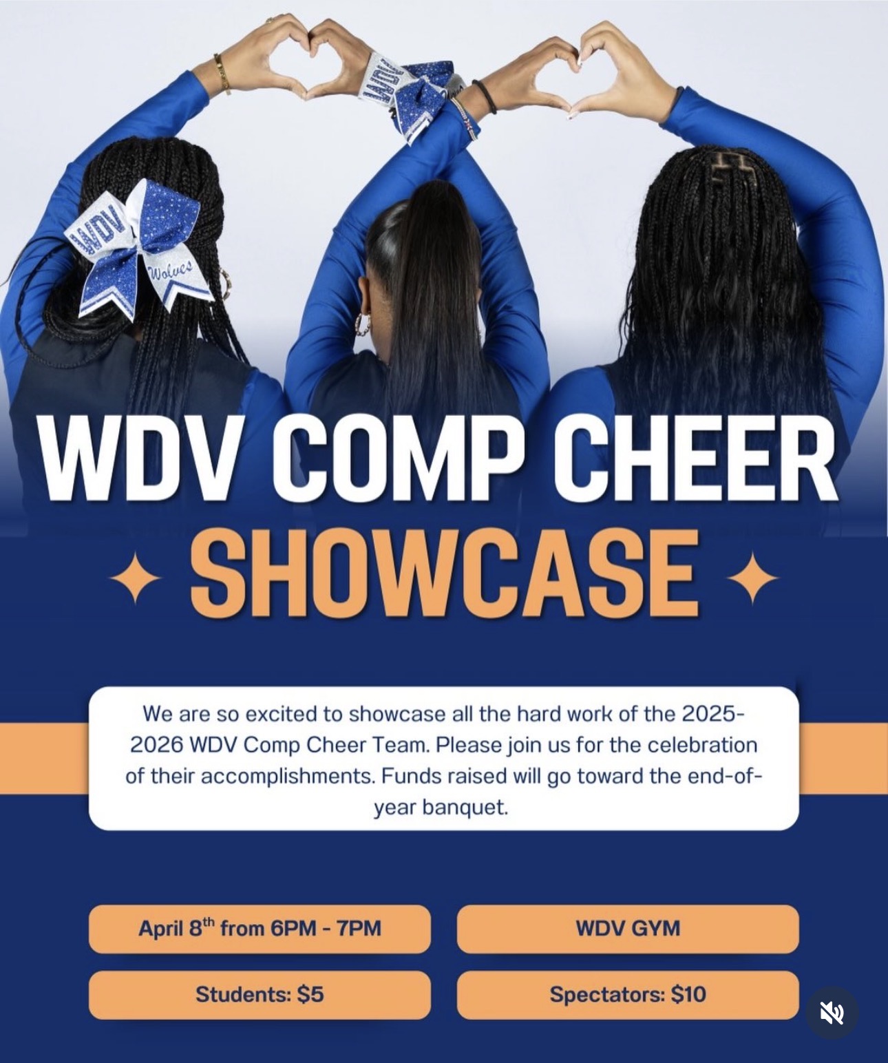 Come out and support your WDV Cheer team as they prepare for upcoming competitions! The showcase will be held in the gym on 4/8 from 6-7pm. Students $5 and spectators $10. Concessions will be sold on site too!